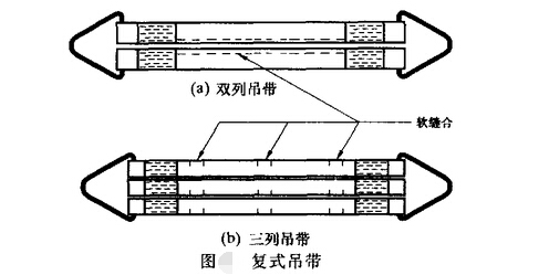 ③復(fù)式吊帶:由兩條或多條寬度相同并排放置的帶子構(gòu)成的吊帶。兒條帶子共有一個(gè)末端件,各條帶子的邊緣相互連接。