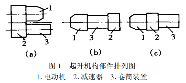 電動葫蘆的起升機(jī)構(gòu)主要有:起升用錐形轉(zhuǎn)子制動電機(jī)、卷筒裝置、減速器和吊鉤裝置4個動力和傳動部件。電機(jī)、減速器和卷筒裝置3個部件的排列有平行軸(a)和同軸兩種排列方式,同軸式有分有(b)和(c)兩種排列,見圖1。