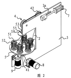 一種環(huán)形穿絲吊裝帶的生產裝置,它包括一塊固定板(3),在固定板(3)上設有用于撐開環(huán)形穿絲吊裝帶(11)的滾輪組(4),滾輪(41)驅動裝置與其中至少一個滾輪(41)相聯(lián)并可通過該滾輪(41)帶動環(huán)形絲吊裝帶(11)轉動,其特征在于,所述的固定板(3)的側部設有一個轉盤(5),在轉盤(5)上設有若干個用于放置線團(52)的線架(51),轉盤(5)具有一個供撐開在滾輪組(4)上的環(huán)形穿絲吊裝帶(11)進入并垂直穿過轉盤(5)中心的缺口(53),上述轉盤(5)與一個當撐開在滾輪(41)組(4)上的環(huán)形穿絲吊裝帶(11)轉動時可帶動轉盤(5)上的各個線架(51)繞環(huán)形穿絲吊裝帶(11)轉動的轉盤(5)驅動裝置相聯(lián)接,所述的轉盤(5)驅動裝置包括一個與電機一(8)相聯(lián)的主驅動齒輪(81),在轉盤(5)的底部中心設有一個與主驅動齒輪(81)相嚙合的轉動齒輪(54),轉動齒輪(54)具有與轉盤(5)上的缺口(53)上下對應的開(54a),在轉動齒輪(54)旁還設有一個副驅動齒輪(82),所述的副驅動齒輪(82)通過同步傳動帶(83)與主驅動齒輪(81)相連。