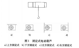 (1)固定式無運(yùn)行機(jī)構(gòu)、固定使用的電動葫蘆,按其安裝方式不同(即座腳在上、下、左、右位置的不同)可分圖1所示四種類型。