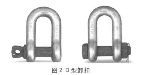 如圖2、3所示,在起重吊裝索具中,卸扣屬于連接件。一般起重用的D型和弓型卸扣均由鍛造制成。卸扣由扣體、銷軸等易拆卸的零件裝配成的組合件,由圖2、3可知,左側(cè)卸扣的銷軸為w型帶孔和抬肩的螺紋銷軸,右側(cè)卸扣的銷軸為X型六角頭螺栓型銷軸,并配有六角螺母和開口銷。兩種形式的卸扣安裝時(shí),均需先將銷軸穿人卸扣本體左側(cè)環(huán)眼至另一端,W型直接擰入卸扣本體緊定,X型需將螺母旋緊緊定或插開口銷緊定。卸扣裝卸時(shí),均需作業(yè)人員雙手操作,且均需要一定的緊定或拆卸時(shí)間。