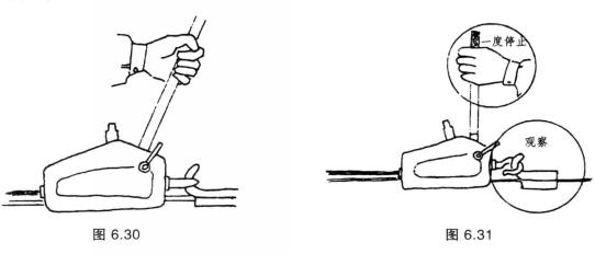 ⑧鋼絲繩固定端,必須確認(rèn)其穩(wěn)定程度或強度,為此,在扳動前進(jìn)桿使被牽引物體剛剛受力時要一度停止扳動,觀察固定端及鋼絲繩有無異常,確認(rèn)無異常后方可繼續(xù)操作,如圖6.31所示。