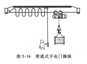 3、滑道式手電門操縱,如圖5-14所示。這種操縱方式可根據(jù)操作人員的實際需要,自由地掌握與吊載的遠近,既安全又方便,是較好的地面操作方式之一。