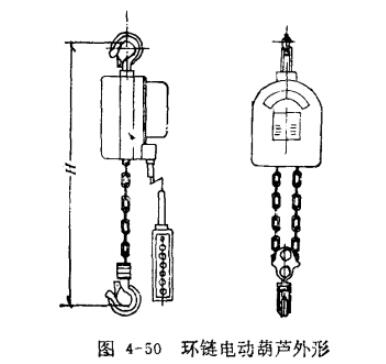 環(huán)鏈電動葫蘆是近幾年發(fā)展起來的小型輕便提升工具。它的主要特點是體積小,自重輕,操作靈活,可代替手拉葫蘆,特別是能實現(xiàn)多臺集中控制,節(jié)省勞動力。環(huán)鏈電動葫蘆的外形如圖4-50