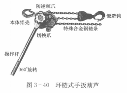 1、環(huán)鏈?zhǔn)绞职夂J(見圖3-40)??堪鈩?dòng)手柄,通過傳動(dòng)機(jī)構(gòu)帶動(dòng)起重鏈條升降重物。環(huán)鏈?zhǔn)绞植话埠J是設(shè)備安裝,貨物起吊、物體固定、綁扎和牽引的理想工具,尤其是任意角度的牽引和在場地狹小,露天作業(yè)及無電源的情況下,更顯示其優(yōu)越性。