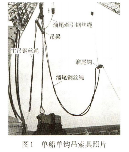 根據(jù)樁長(zhǎng)、樁重、水深、吊耳高度及吊距,選用單鉤起重船。吊索具配置有溜尾狗鉤、溜尾鋼絲繩、溜尾牽引鋼絲繩、吊梁及主吊鋼絲繩等。先采用卡環(huán)將溜尾鉤與溜尾鋼絲繩連接;然后將吊梁、主吊鋼絲繩、溜尾鋼絲繩掛在主鉤上,采用牽引鋼絲繩將溜尾鋼絲繩上端與副鉤相連,見圖1。