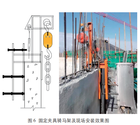 (1)用塔吊將固定夾具騎馬架、電動(dòng)葫蘆吊裝到檐溝操作平臺(tái)作業(yè)面處。固定夾具騎馬架騎扣在倉(cāng)壁鋼牛腿預(yù)埋件的正上方。在每個(gè)固定夾具騎馬架馬頭上掛鉤孔掛 1 個(gè) 6.8T 電動(dòng)葫蘆,本項(xiàng)目共設(shè)計(jì)26個(gè),其數(shù)量依據(jù)為荷載:桁架23.58T+模板、鋼管、扣件、施工荷載 15.78T=39.36T ;電動(dòng)葫蘆起重荷載6.8T,葫蘆荷載減半計(jì)算為3.4T,39.36/26=1.52T,所以選擇 26 個(gè) 6.8T 的電動(dòng)葫蘆足以滿(mǎn)足施工要求(見(jiàn)圖6)。