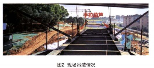 (4)吊裝工具進(jìn)場(chǎng)驗(yàn)收。手拉葫蘆是主要的吊裝工具,手拉葫蘆進(jìn)場(chǎng)前,復(fù)核葫蘆的額定起重量是否滿足要求,查驗(yàn)相關(guān)的合格證和檢驗(yàn)報(bào)告。本項(xiàng)目吊裝的懸挑結(jié)構(gòu)單根主梁最大重量11t,考慮一端固定一端懸挑,懸挑端采用額定起重量為10t的手拉葫蘆可以滿足要求。驗(yàn)收進(jìn)場(chǎng)的鋼絲繩直徑是否符合方案的要求,是否有起毛、斷絲、磨損的情況。如果有異常,驗(yàn)收卸扣規(guī)格尺寸等能否滿足吊裝要求用。
