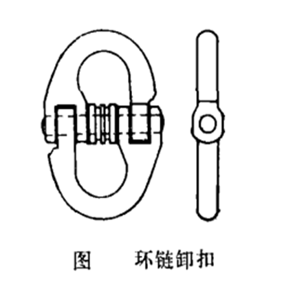 圖中a是U型帶鎖緊螺母卸扣,適于在高處或不易發(fā)現(xiàn)其松脫處使用;b為馬蹄形卸扣,具有較大的環(huán)腔;c是帶滾輪卸扣;d是長環(huán)腔卸扣,適合于不同的使用條件。國外還應用一種適合于鏈條作業(yè)用的卸扣,下圖是瑞典公司生產的鏈環(huán)卸扣,用它可以靈活地調整鏈條索具的分支或更換夾具。