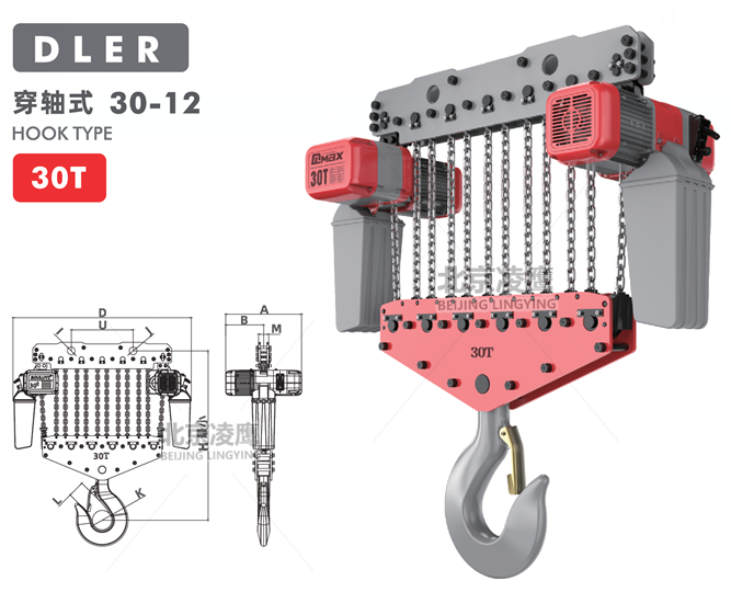 30噸DLER環(huán)鏈電動葫蘆穿軸式重物吊上吊下都有極限開關(guān)裝置,使電機自動停止,以防止鏈條超出,確保安全。