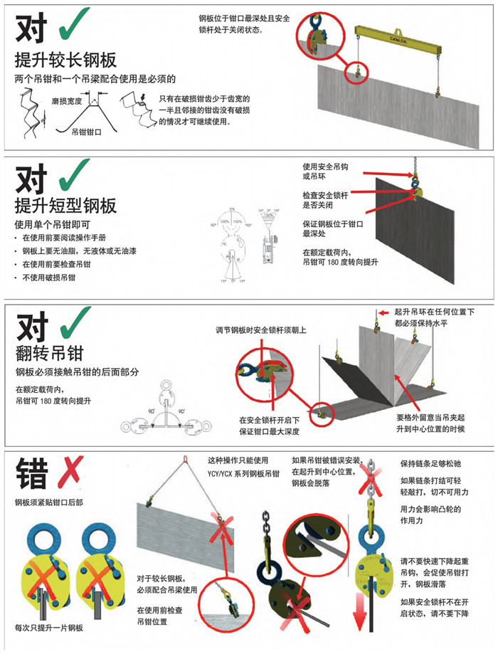 CDH型豎吊起重鉗適用于鋼板豎直吊裝,此種鋼板吊鉗采用首鋼低碳優(yōu)質(zhì)合金鋼制造,載荷范圍為0-10噸。它只能同時(shí)吊裝一塊鋼板,嚴(yán)禁層疊吊裝。吊鉗起 吊時(shí)必須將拉環(huán)手柄向上,以使彈簧拉緊,卸荷時(shí)拉環(huán)手柄向下,彈簧放松后簽字和鋼板才能分離,且吊裝過(guò)程中不得碰撞被吊物,嚴(yán)禁超載使用。帶彈簧鎖無(wú)作業(yè) 狀態(tài)下,鎖具自然加緊,吊上物體夾力成比例增強(qiáng)。本產(chǎn)品嚴(yán)格按國(guó)家3包執(zhí)行,產(chǎn)品質(zhì)量由中國(guó)人民保險(xiǎn)公司(PICC)承保,請(qǐng)放心使用。